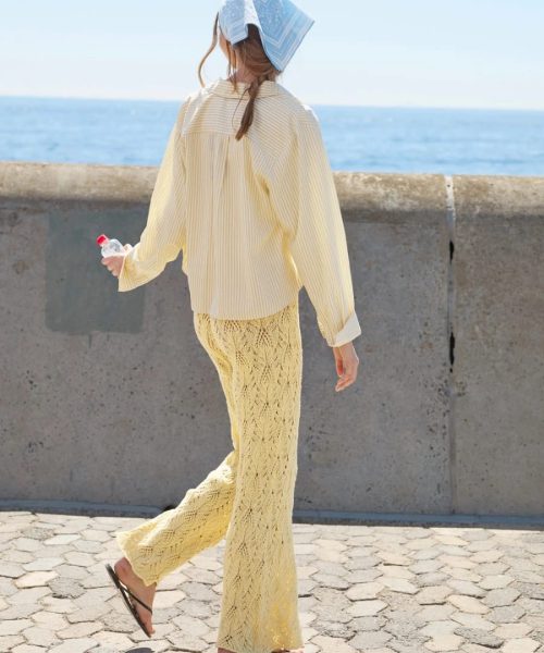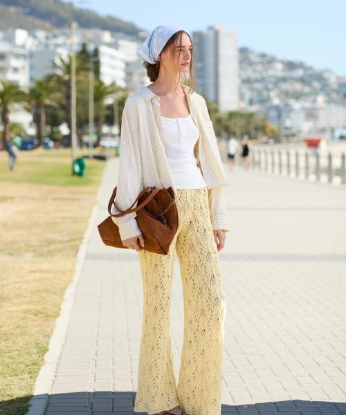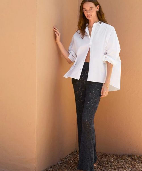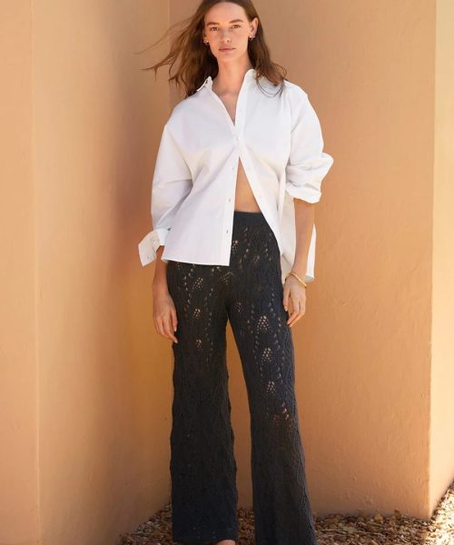 Luftig bukse strikket ovenfra og ned i Line eller dobbel Tynn Line, med elastisk linning og romslig passform.