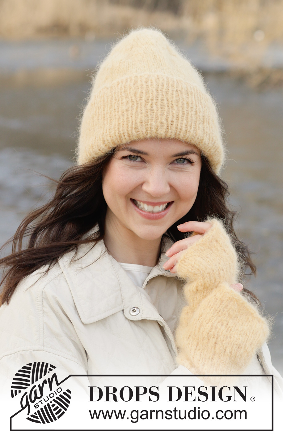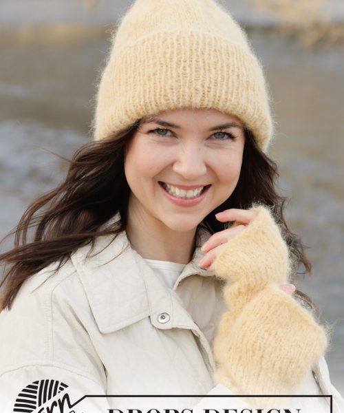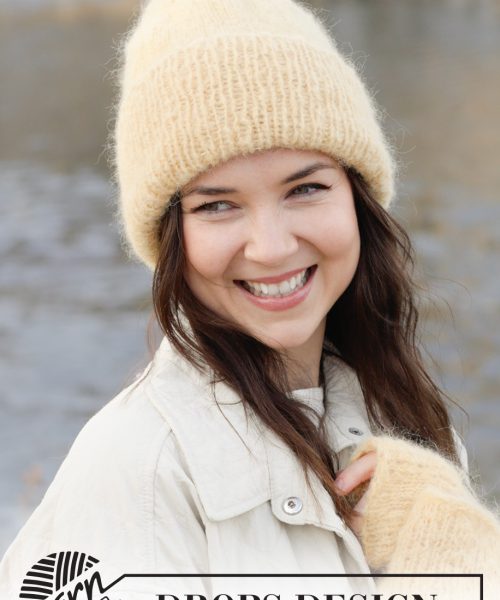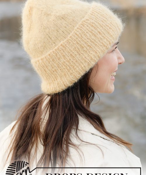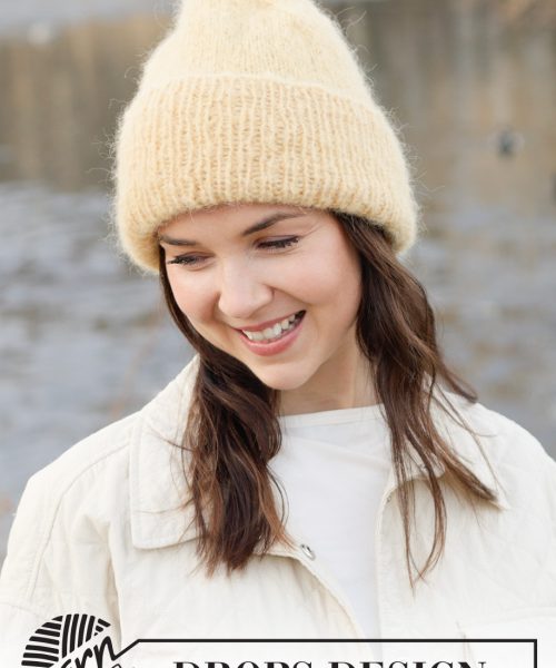 Strikket lue i 1 tråd DROPS Melody eller 2 tråder DROPS Brushed Alpaca Silk. Arbeidet strikkes nedenfra og opp med glattstrikk og vrangbord.