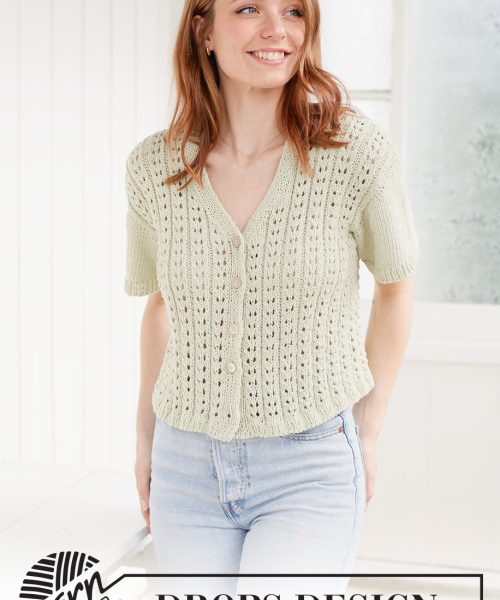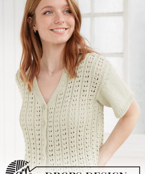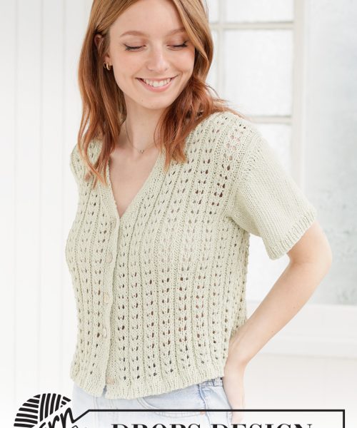 Strikket jakke med korte ermer i DROPS Cotton Light. Arbeidet strikkes nedenfra og opp med hullmønster, v-hals og i-cord.