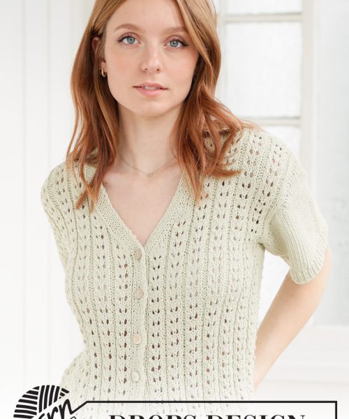 Strikket jakke med korte ermer i DROPS Cotton Light. Arbeidet strikkes nedenfra og opp med hullmønster, v-hals og i-cord.