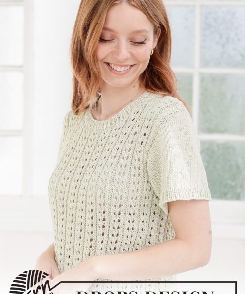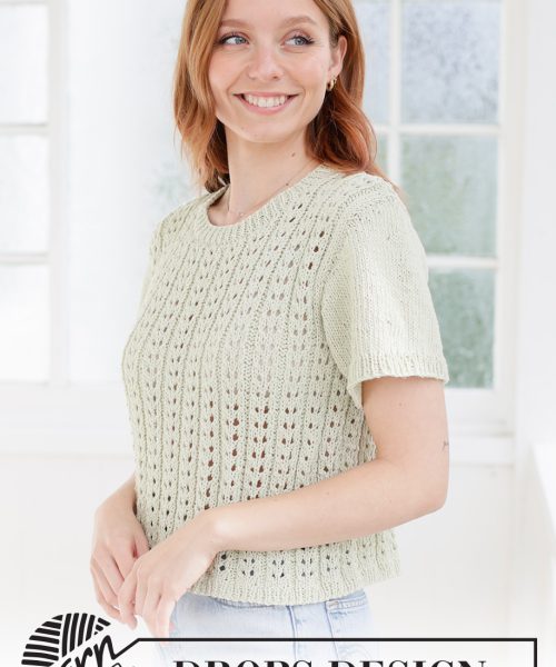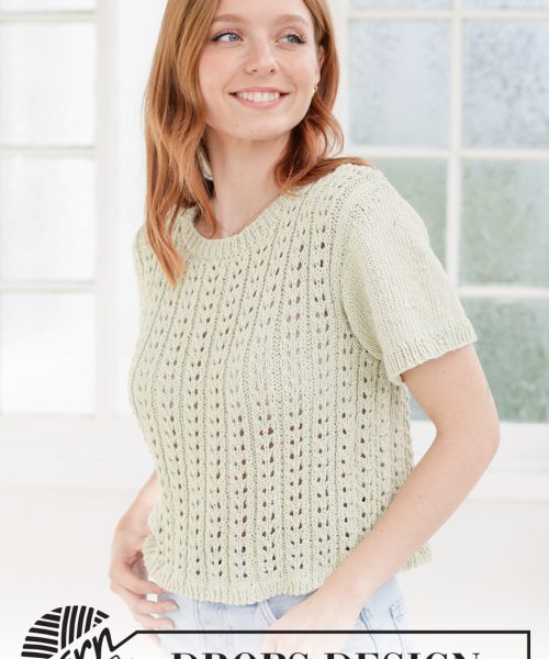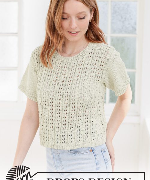 Strikket genser med korte ermer i DROPS Cotton Light. Arbeidet strikkes nedenfra og opp med hullmønster.