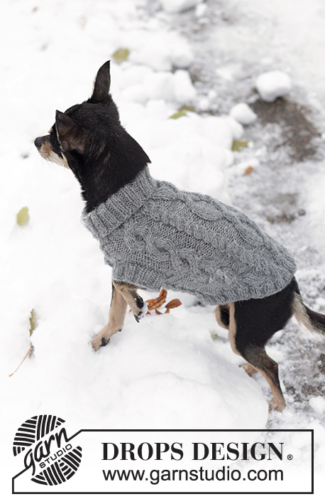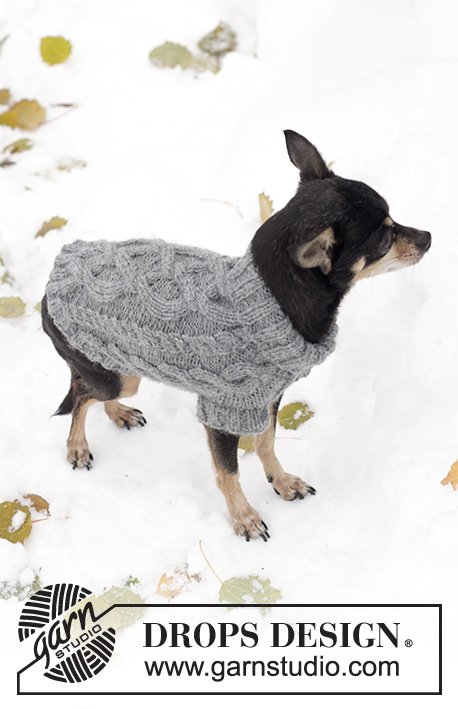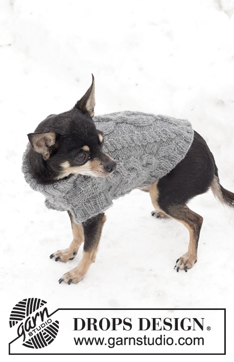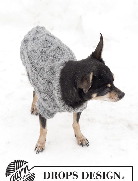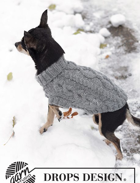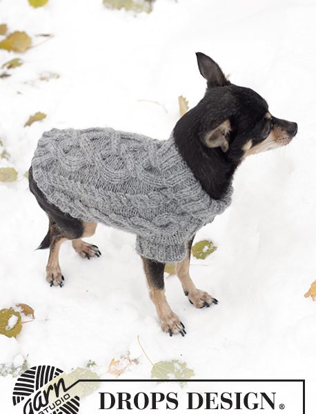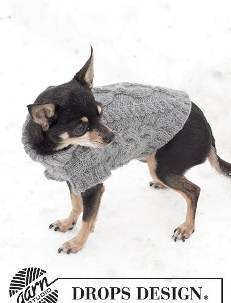 Strikket DROPS hundegenser i ”Karisma” med flettemønster.