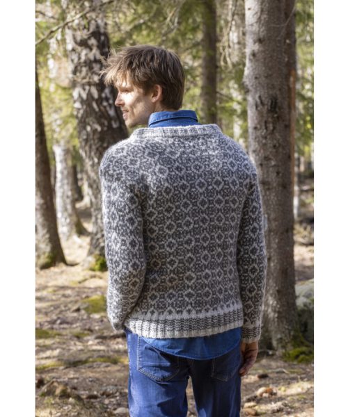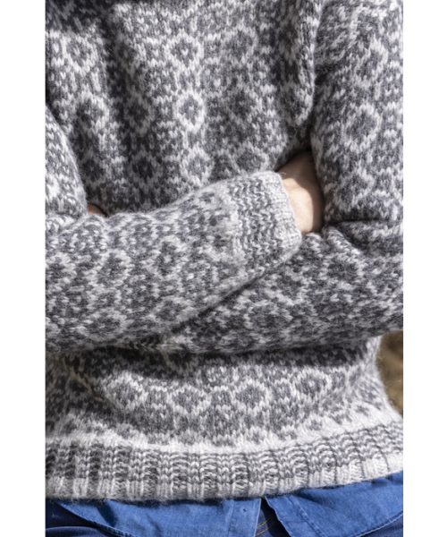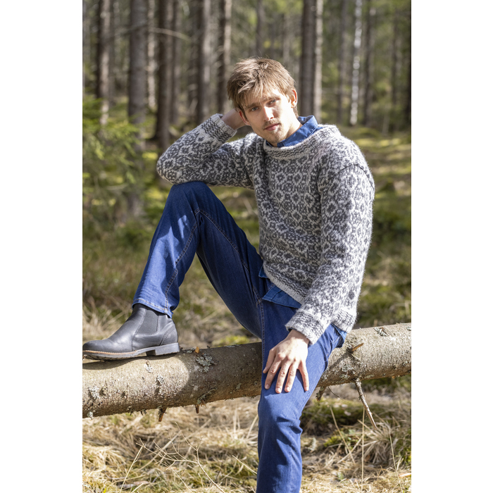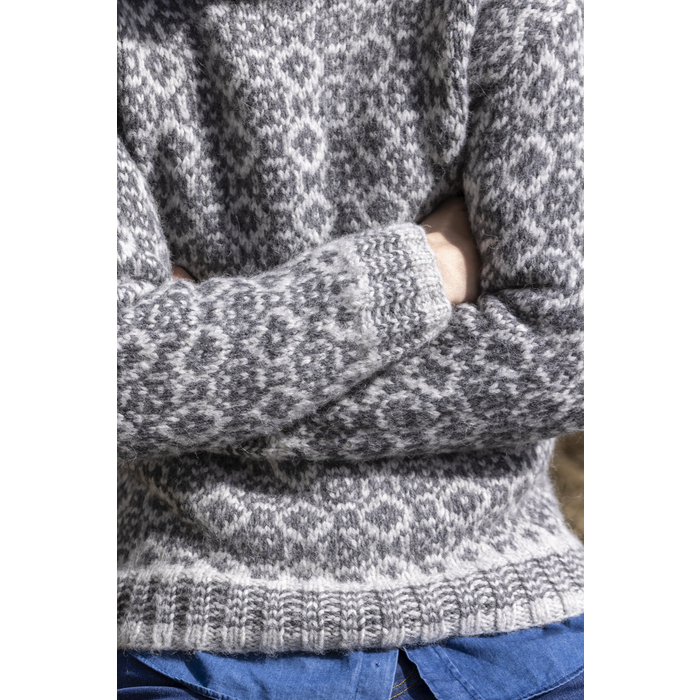 UVDAL genser i lys grå melert hovedfarge med vakkert mønster i koks melert og rund hals. Grenseren er deilig myk mot huden og strikkes i garnet Pus, som inneholder 70 prosent babyalpakka. Nyt den varme pusete følelsen mot kroppen og unn deg, eller en av dine kjære, litt ekstra luksus.