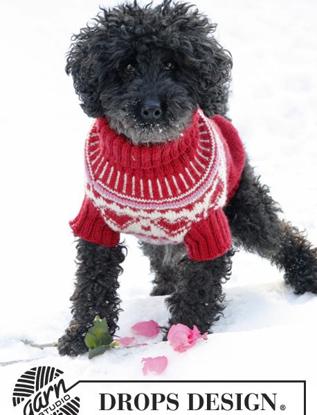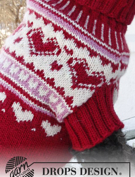 Strikket DROPS hundegenser / julegenser i ”Karisma” med hjerter. Str XS – L. Tema: Valentine