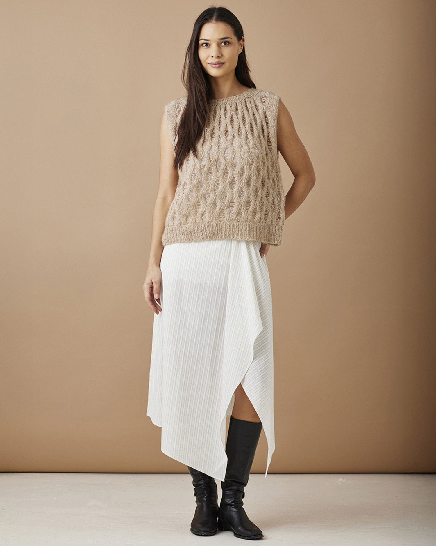 | Beskrivelse: | Vesten strikkes nedenfra etter diagram med tapte/slupne masker. Modellen kan strikkes i to deler som sys sammen, eller strikkes rundt og deles ved ermehullet. |