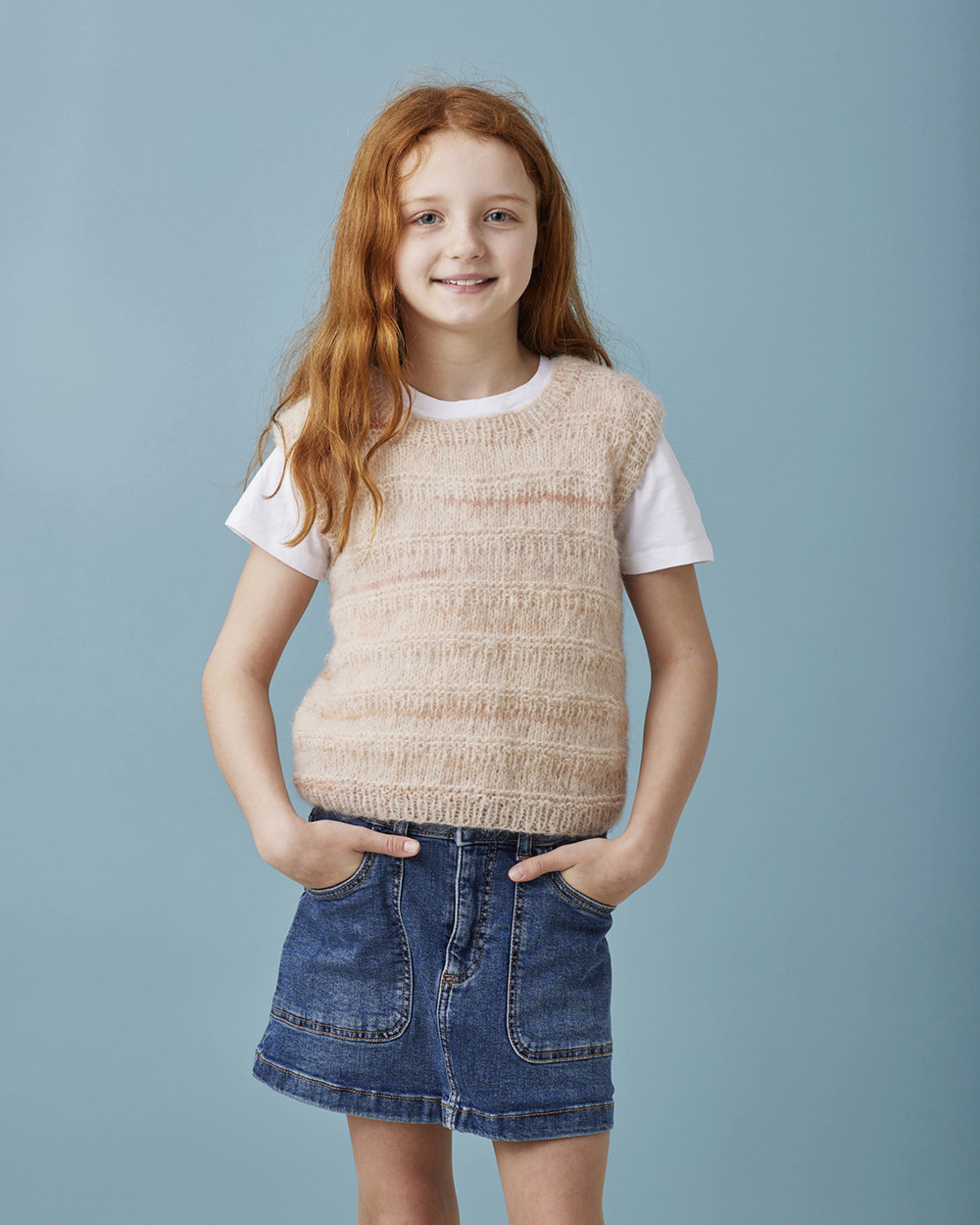| Beskrivelse: | Modellen strikkes nedenfra og opp i 2 deler strukturmønster. Sys sammen og til sist strikkes hals- og armkanter på. |