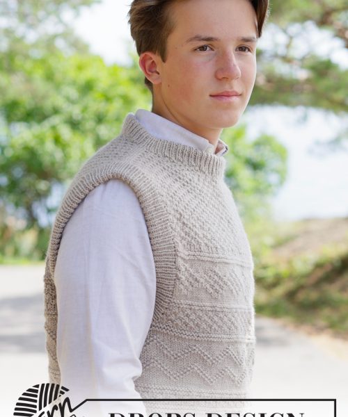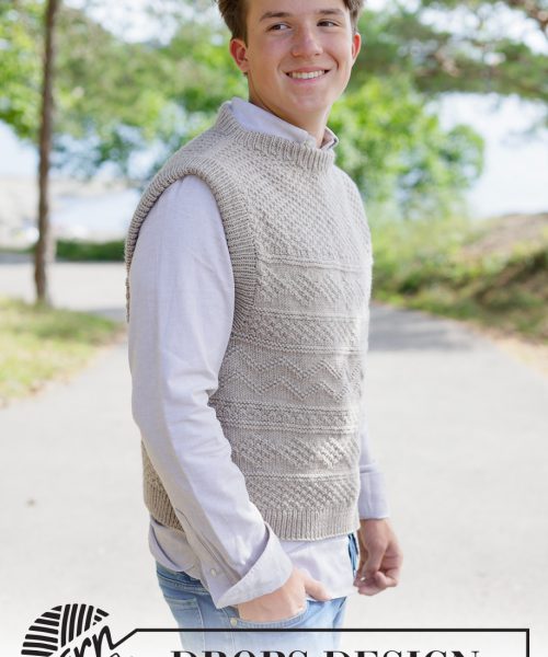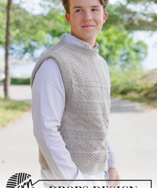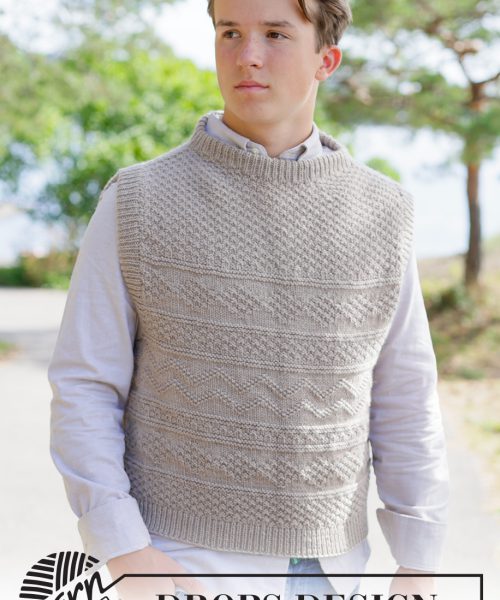 Strikket vest til herre i DROPS Karisma eller DROPS Merino Extra Fine. Arbeidet strikkes ovenfra og ned med skrå skulder, relieffmønster og rund hals. Størrelse XS – XXL.